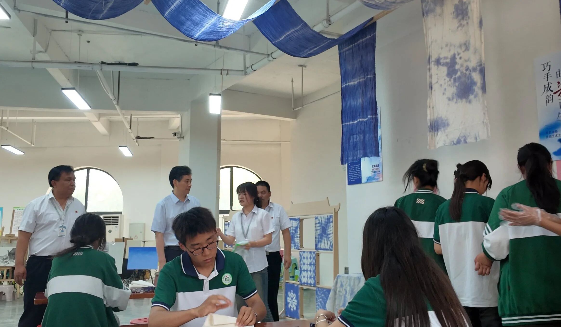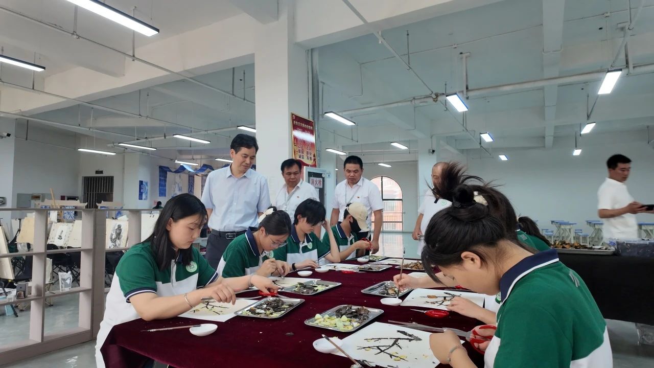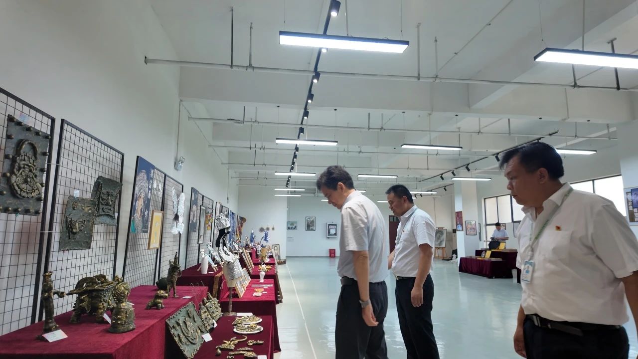楊市長(zhǎng)重點(diǎn)參觀了藝文中專學(xué)校的非遺創(chuàng)意產(chǎn)業(yè)學(xué)院,由該校師生共同創(chuàng)作的樂石硯、蝶翅畫、錫紙畫、青銅文創(chuàng)、五谷豐登糧食畫等作品,楊市長(zhǎng)給予了充分肯定。
