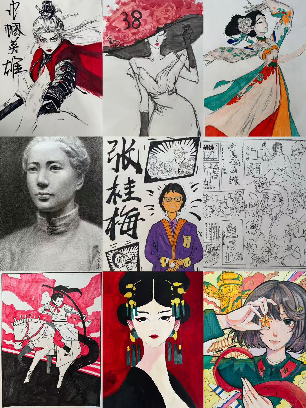 繪畫專業(yè)學生以“巾幗英雄”為主題創(chuàng)作系列海報,生動刻畫革命歷史與現代職場中的女性形象。同時專題展區(qū)集中展示我校女性教師的教學成果、公益行動事跡,全面彰顯“她力量”的紅色底蘊與時代風采。