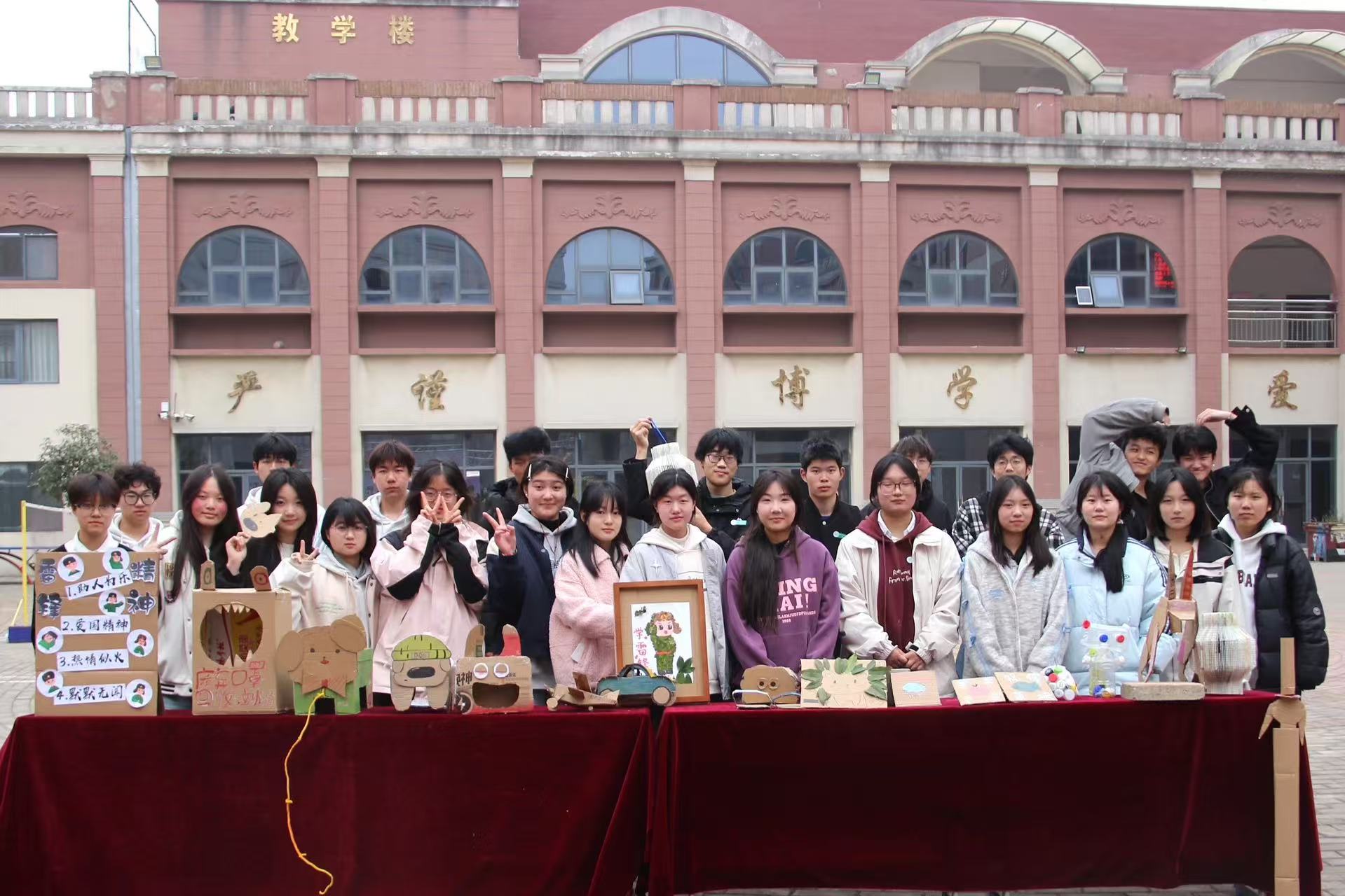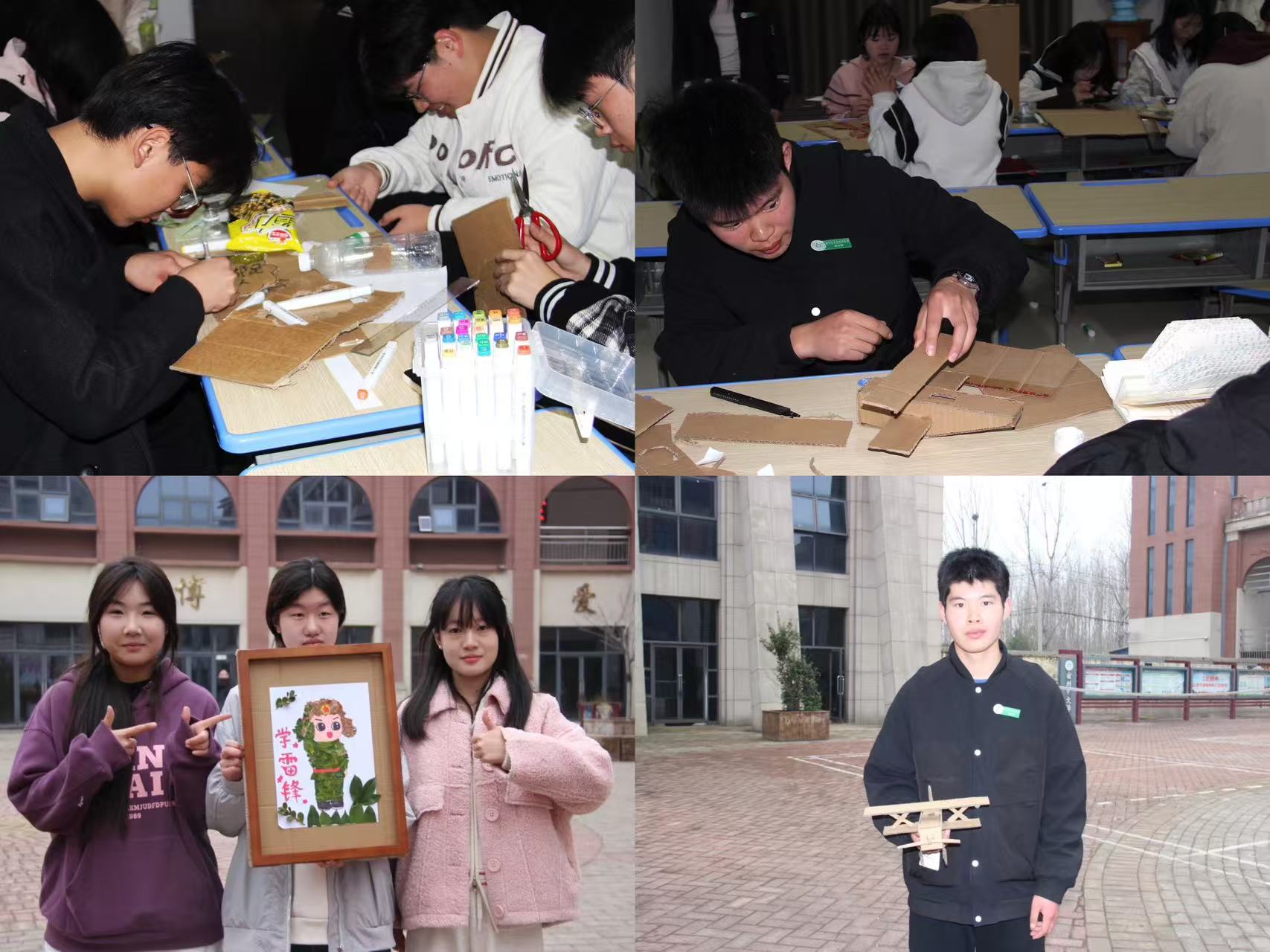 依托學校“藝術(shù)育人”特色,學生科組織美術(shù)、設(shè)計、社會文化與藝術(shù)等專業(yè)學生,將清理出的廢舊紙箱、塑料瓶等材料“變廢為藝”,創(chuàng)作了多組裝置藝術(shù)作品。這些作品陳列于教學樓走廊、文化廣場等公共區(qū)域,將雷鋒精神具象化為可視化的藝術(shù)語言。