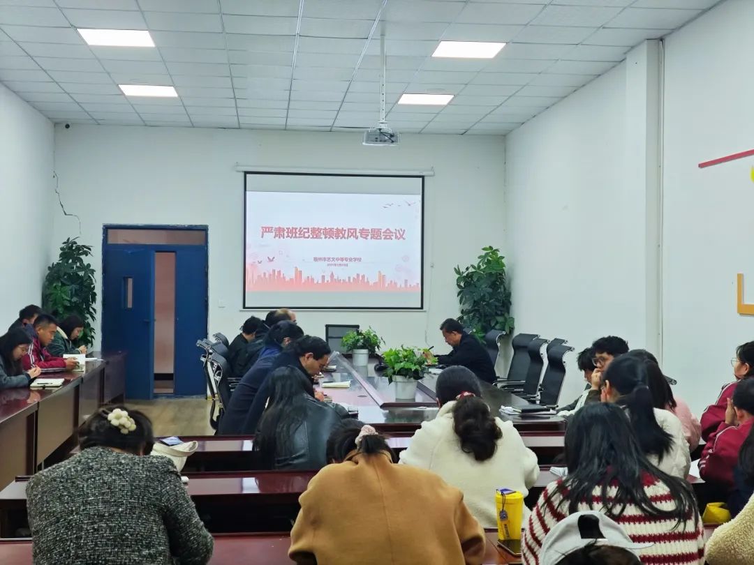 2025年3月28日下午,宿州市藝文中等專業(yè)學(xué)校在藝術(shù)樓二樓召開“嚴(yán)肅班紀(jì)、整頓教風(fēng)”專題會(huì)議,全體教職工參會(huì)。會(huì)議聚焦課堂教學(xué)規(guī)范、師德師風(fēng)建設(shè)及教學(xué)質(zhì)量提升,旨在進(jìn)一步強(qiáng)化教學(xué)管理,營(yíng)造嚴(yán)謹(jǐn)務(wù)實(shí)的育人氛圍。