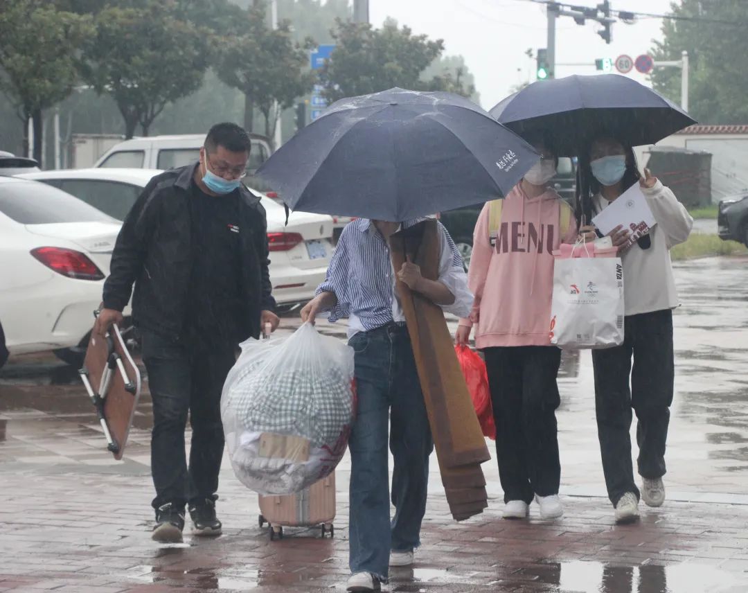 即使天氣微涼,天空中下著小雨,也仍然擋不住學(xué)生們期待的心情。校門(mén)剛剛打開(kāi),學(xué)生和家長(zhǎng)們就拎著大包小包陸續(xù)到來(lái)了。