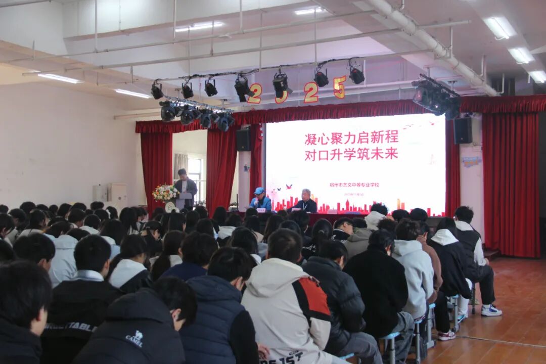 為了指引高考沖刺方向,增強迎考信心,激發(fā)拼搏精神,11月5日上午,宿州市藝文中等專業(yè)學(xué)校在圖書館隆重舉行2023級對口升學(xué)高考激勵動員大會。學(xué)校執(zhí)行校長朱華、教務(wù)科科長張國芳、23級年級組長石全文、對口班班主任及全體23級學(xué)生參加大會。