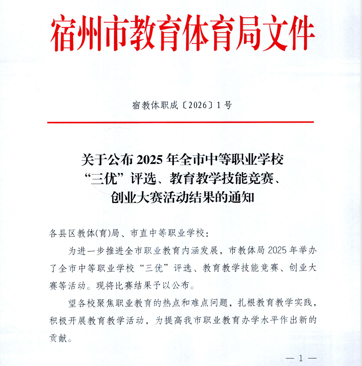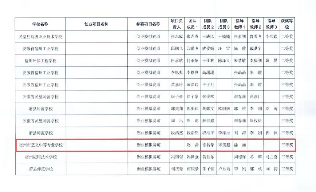 近日,2025年宿州市全市中等職業(yè)院校創(chuàng)業(yè)大賽比賽結(jié)果公示,我校趙磊、徐智豪、宋美鑫三位同學(xué)(指導(dǎo)老師:潘涵)憑借出色表現(xiàn),在創(chuàng)業(yè)模擬賽項(xiàng)中榮獲市級(jí)三等獎(jiǎng)。