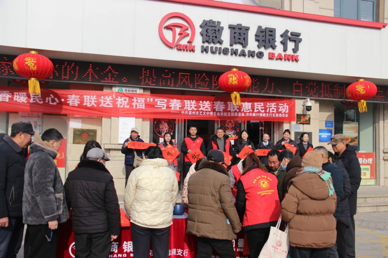筆墨傳情迎新春,黨建惠民暖人心。為深入踐行黨建引領(lǐng)服務(wù)群眾理念,傳承中華優(yōu)秀傳統(tǒng)文化,2026年2月3日,中共宿州市藝文中等專業(yè)學(xué)校支部委員會(huì)攜手徽行拂曉支行黨支部,在徽行拂曉支行門前廣場舉辦“墨香暖民心·春聯(lián)送祝福”惠民活動(dòng),以筆墨為媒,為屬地居民送上最真摯、最溫暖的新春問候。