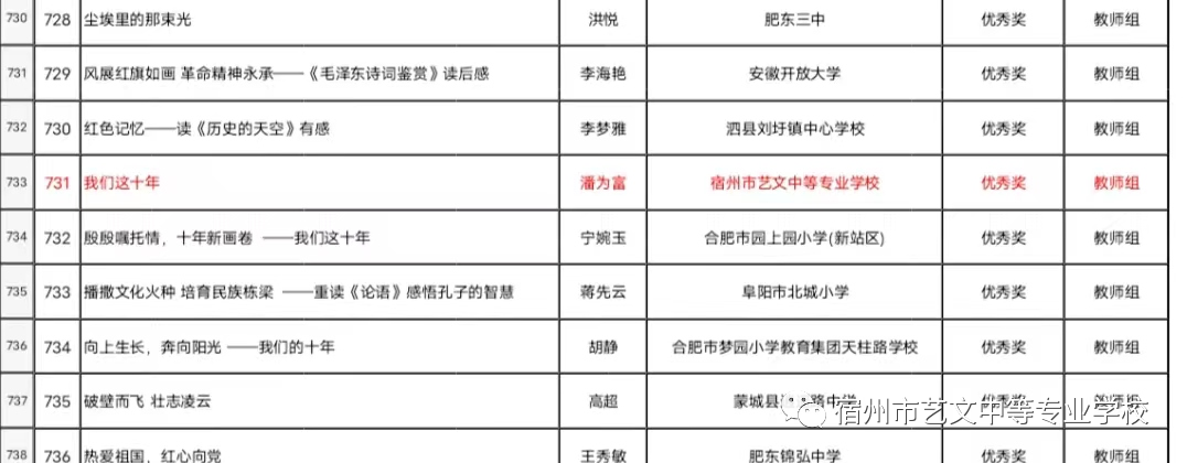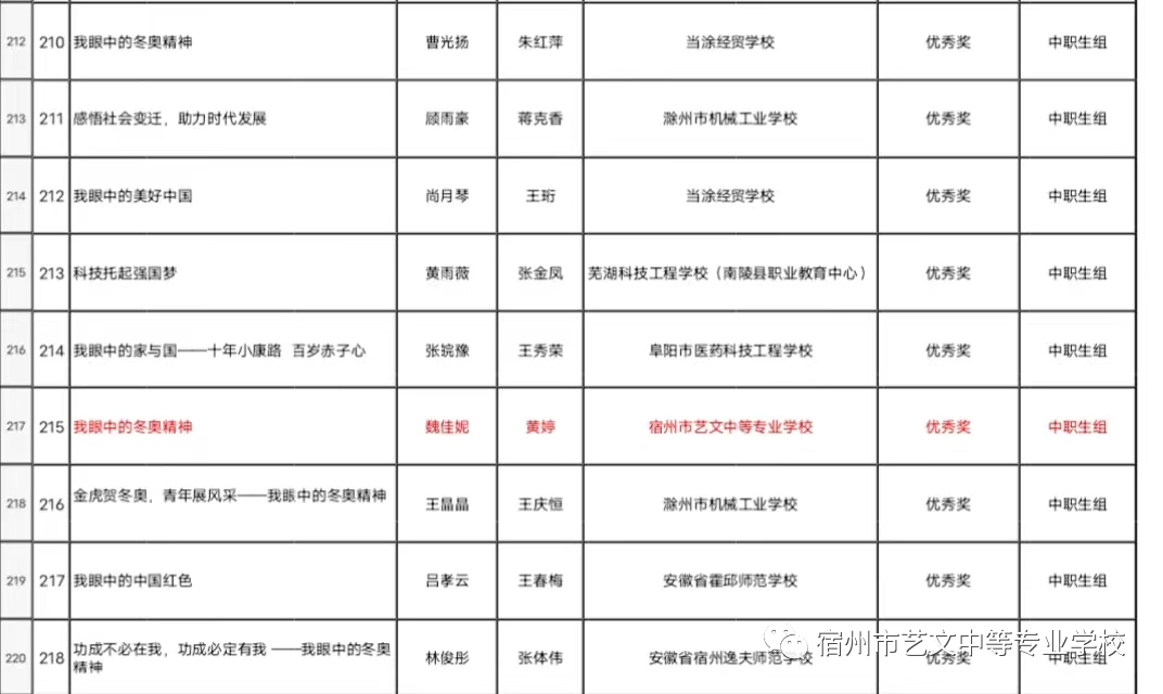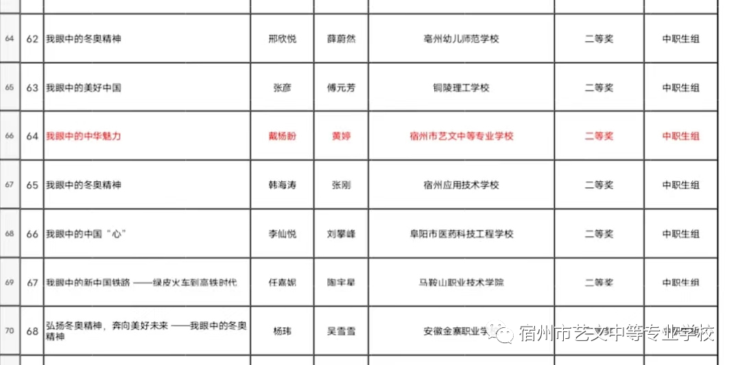 藝文學(xué)校于安徽省第六屆校園讀書(shū)創(chuàng)作活動(dòng)(“喜迎二十大,奮進(jìn)新征程”主題征文比賽)中再獲佳績(jī)!本次活動(dòng)共七名師生獲得佳績(jī),其中潘為富老師作品《我們這十年》榮獲教師組優(yōu)秀獎(jiǎng),王文曦同學(xué)作品《我眼中的奧運(yùn)精神》榮獲中職生組讀書(shū)創(chuàng)作之星,名列全省五名創(chuàng)作之星之首,戴楊盼同學(xué)作品《我眼中的中華魅力》榮獲中職生組二等獎(jiǎng),王瀅瀅同學(xué)作品《我眼中的華夏榮光》、高子怡同學(xué)作品《我眼中的人文中國(guó)》榮獲中職生組三等級(jí),謝方馨同學(xué)作品《我眼中的冬奧精神》、魏佳妮同學(xué)作品《我眼中的冬奧精神》榮獲中職生組優(yōu)秀獎(jiǎng),指導(dǎo)老師黃婷。