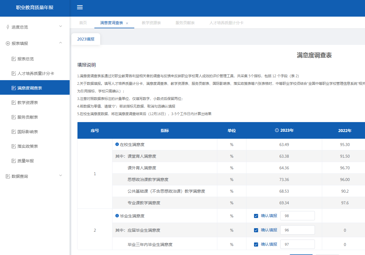 上述4類評(píng)價(jià)的結(jié)果只能作為教學(xué)教育質(zhì)量考核的第一維度,第二維度主要參考滿意度調(diào)查數(shù)據(jù)。即學(xué)校通過開展教職工、學(xué)生、家長(zhǎng)、用人單位滿意度調(diào)查以及師生座談會(huì)等方式,獲得多元主體對(duì)學(xué)校教育教學(xué)質(zhì)量和人才培養(yǎng)質(zhì)量滿意度的相關(guān)數(shù)據(jù)。通過反饋的數(shù)據(jù),改進(jìn)教育教學(xué)模式,提高教學(xué)質(zhì)量,辦人民滿意的學(xué)校。